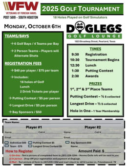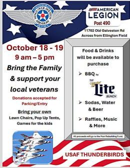 Post 490 host many events throughout the year. Post events include AirShow viewing event, Crawfish Boil, Holiday Parties, Hall Rental events,